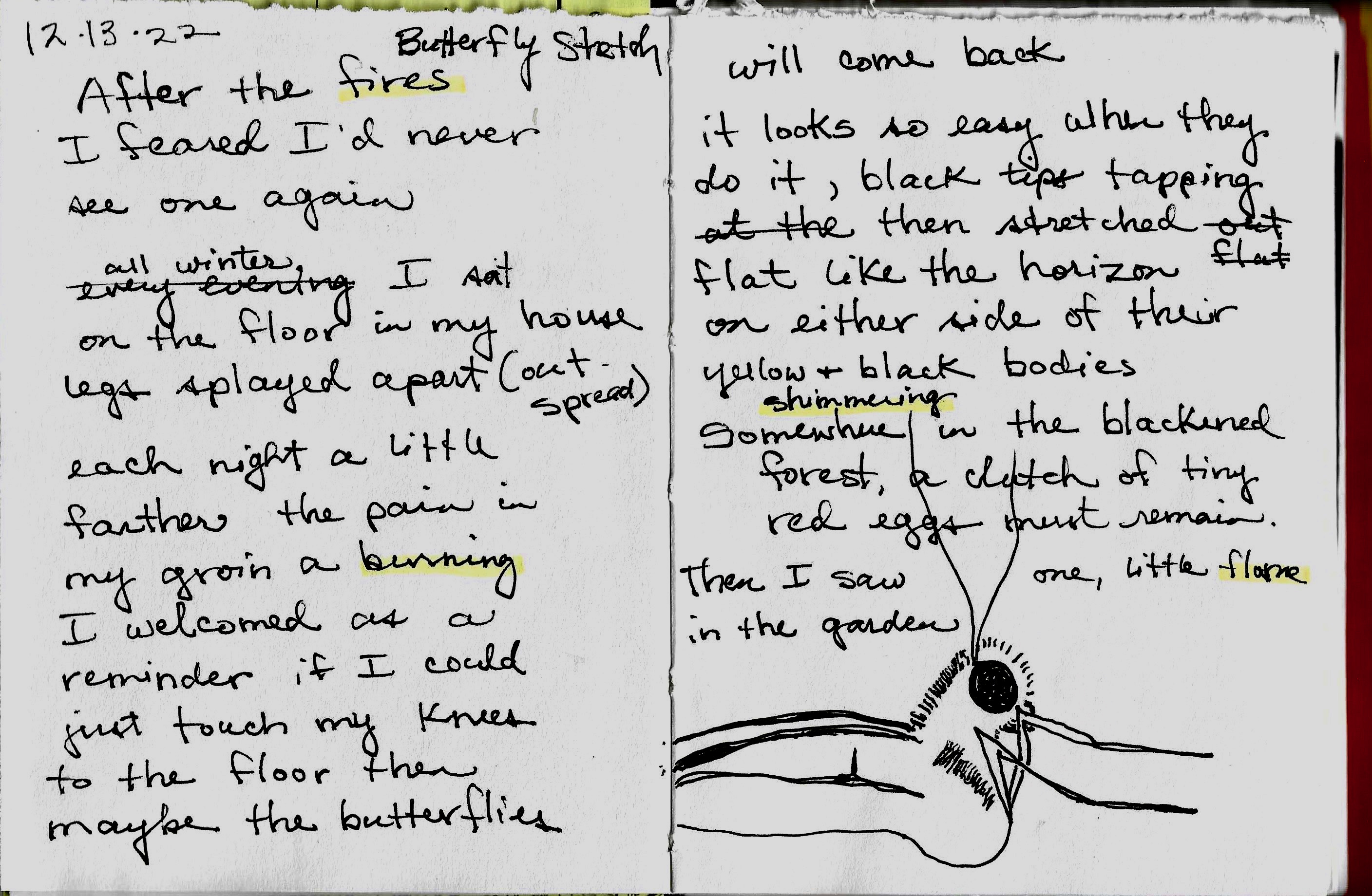 Something I find rewarding is a personal notebook tour. I’ll go back through the previous year’s journals, looking for the germ of an idea, the thing that led to a finished piece of writing. The image below shows the beginning of the poem “Butterfly Pose:”
